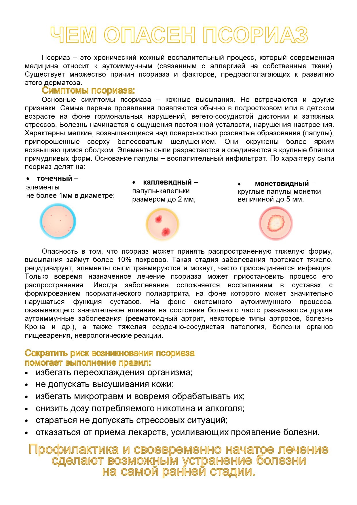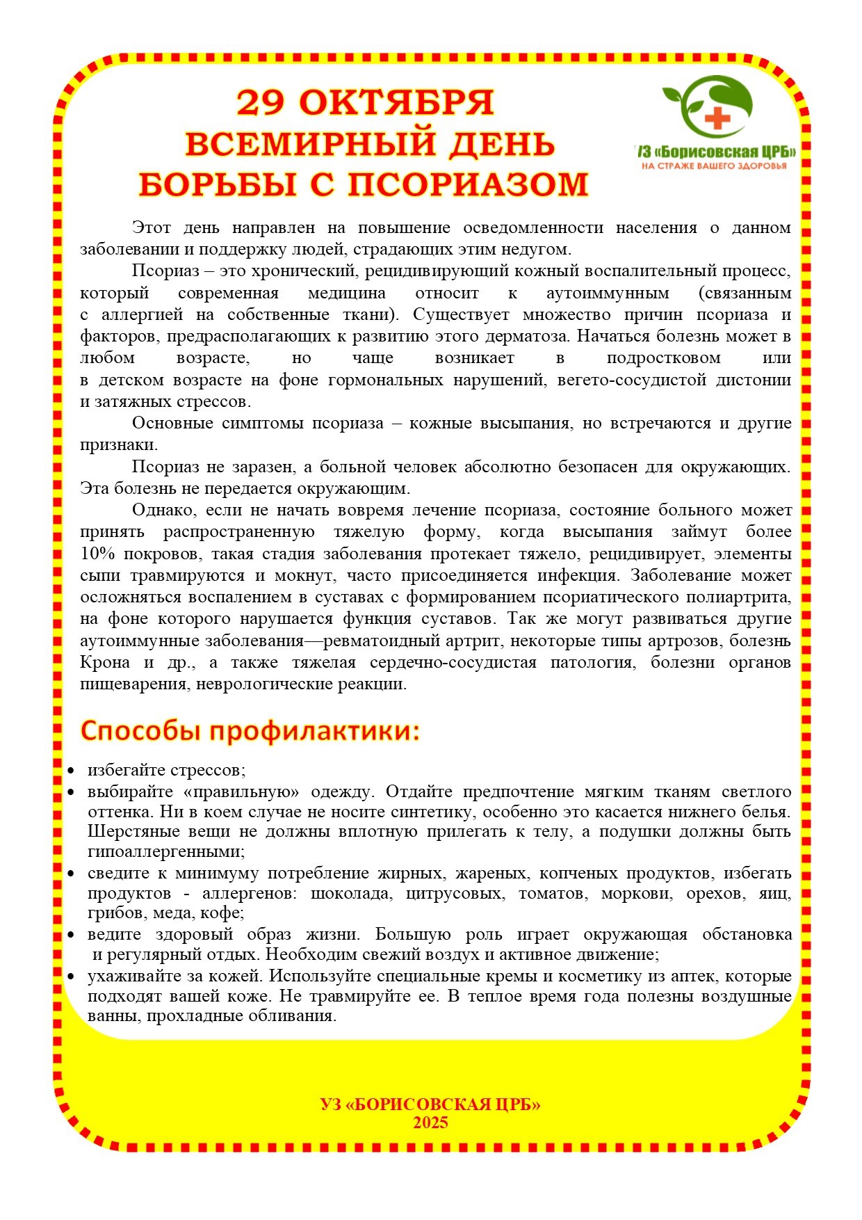 29 ОКТЯБРЯ ВСЕМИРНЫЙ ДЕНЬ БОРЬБЫ С ПСОРИАЗОМ Псориаз — это хроническое воспалительное заболевание кожи, которое проявляется в виде красных, шелушащихся пятен, покрытых серебристыми чешуйками. Это заболевание может значительно повлиять на качество жизни, вызывая не только физический дискомфорт, но и психологические проблемы. Может проявляться в форме каплевидного псориаза, развиваться после инфекций, например, стрептококковой ангины. Важна адаптация лечения для детей, а также эмоциональная поддержка и обучение, как управлять заболеванием. Псориаз протекает с периодами обострений и ремиссий. Полностью вылечить его невозможно, но можно достичь стойкой ремиссии, следуя простым правилам. Включает местные и системные препараты: Псориаз — серьезное заболевание, требующее внимательного подхода. Знание триггеров помогает снизить обострения и добиться ремиссии. Не забывайте консультироваться с врачом для составления индивидуального плана лечения.