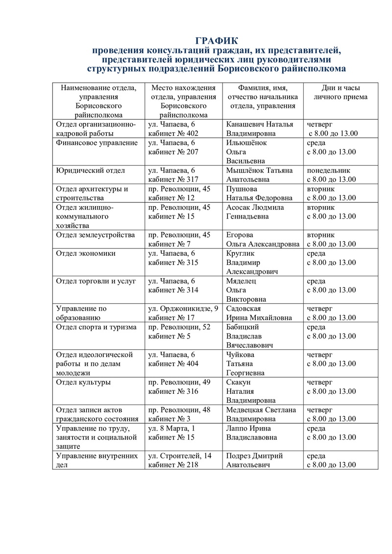 Личный прием к председателю Борисовского райисполкома существляется по предварительной записи.